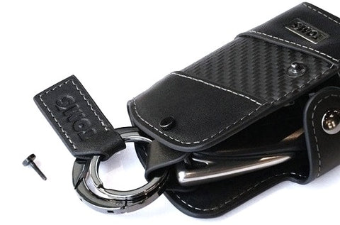 It comes with a convenient carabiner for easy travel and can be attached to a belt loop. It also has a snap button to protect your car's smart key from impacts and scratches. The use of genuine leather and premium synthetic leather with a carbon fiber pattern gives it a sporty look, while the TOM'S plate logo adds a touch of luxury. The gray stitching creates a subdued impression.